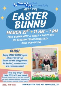 It’s time for our annual Easter Bunny Meet & Greet! Hop on in from 11am-1pm, NO sign-up is required. This is a FREE event! Enjoy half price open play during our 10am-12pm session. 10am-12pm will be the ONLY available session that we have today due to private parties. Reservations for the playground are HIGHLY recommended. Spots will start filling up early! We can’t wait to see everyone there!